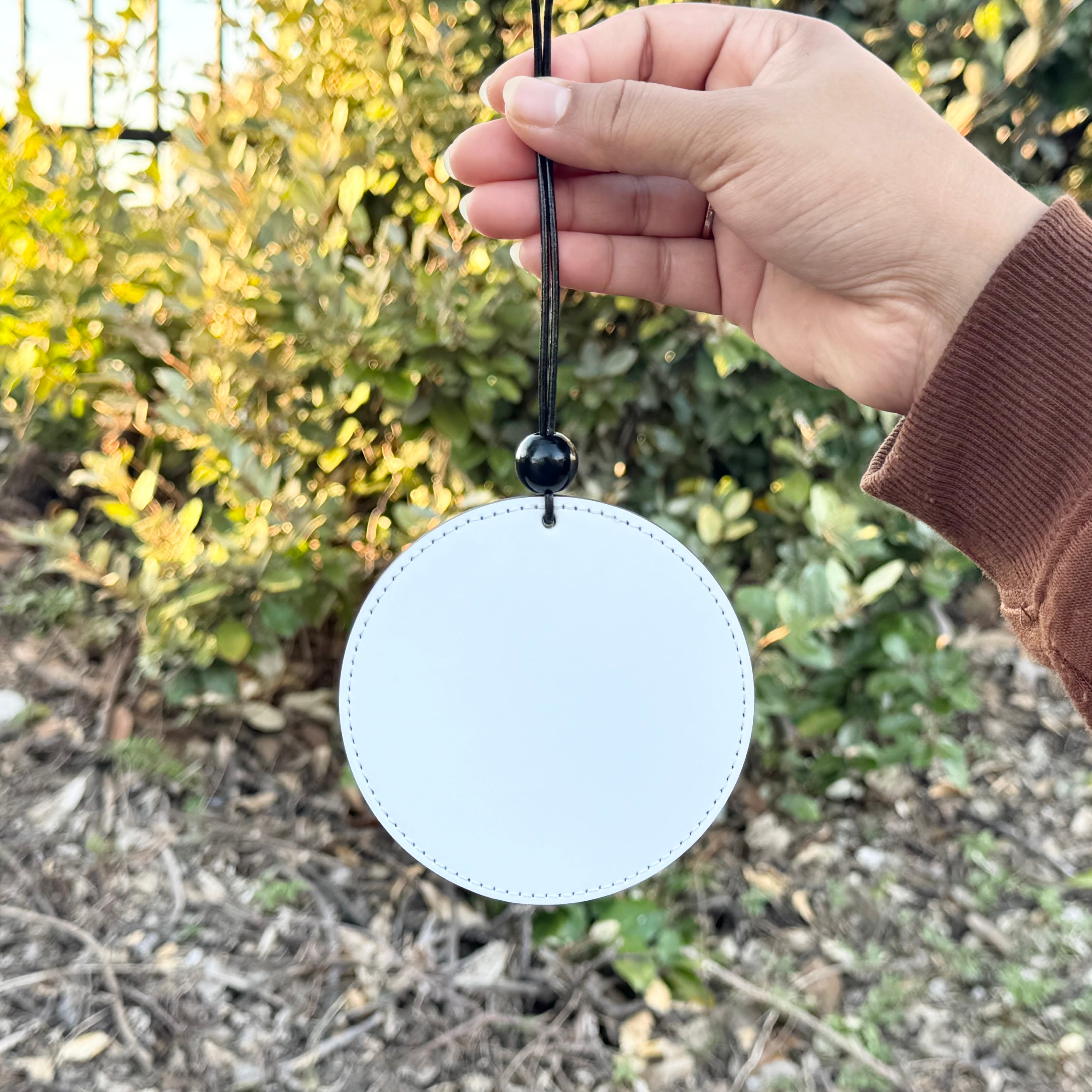 Add style and personality to your car with this 4” round PU leather ornament. Featuring a smooth printable front and a high-quality black PU leather back, it’s perfect for displaying custom designs, names, or photos. The ornament includes a black bead and a 6” leather cord for easy hanging. A unique gift for car lovers, friends, or family—great for birthdays, holidays, or everyday use.